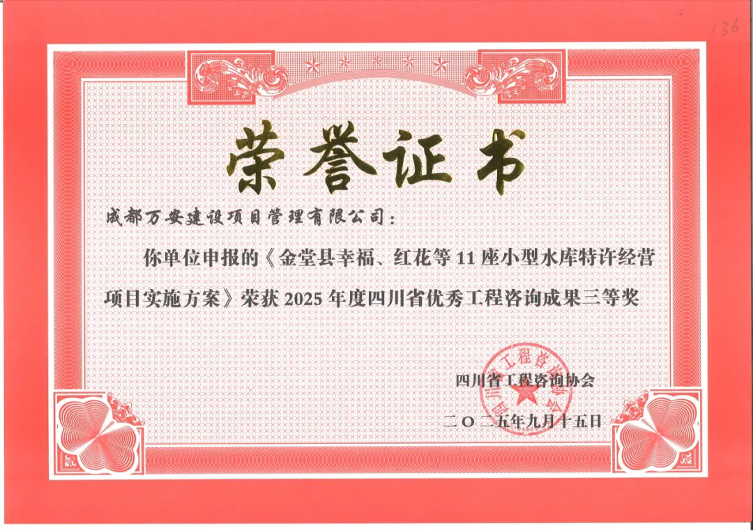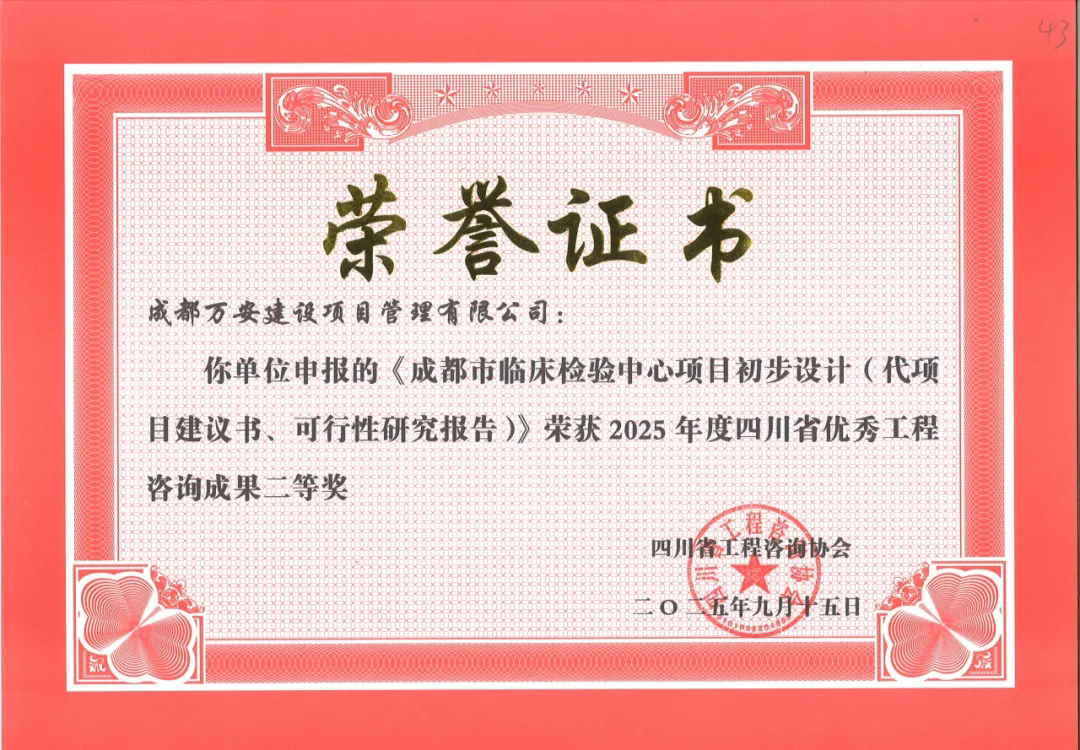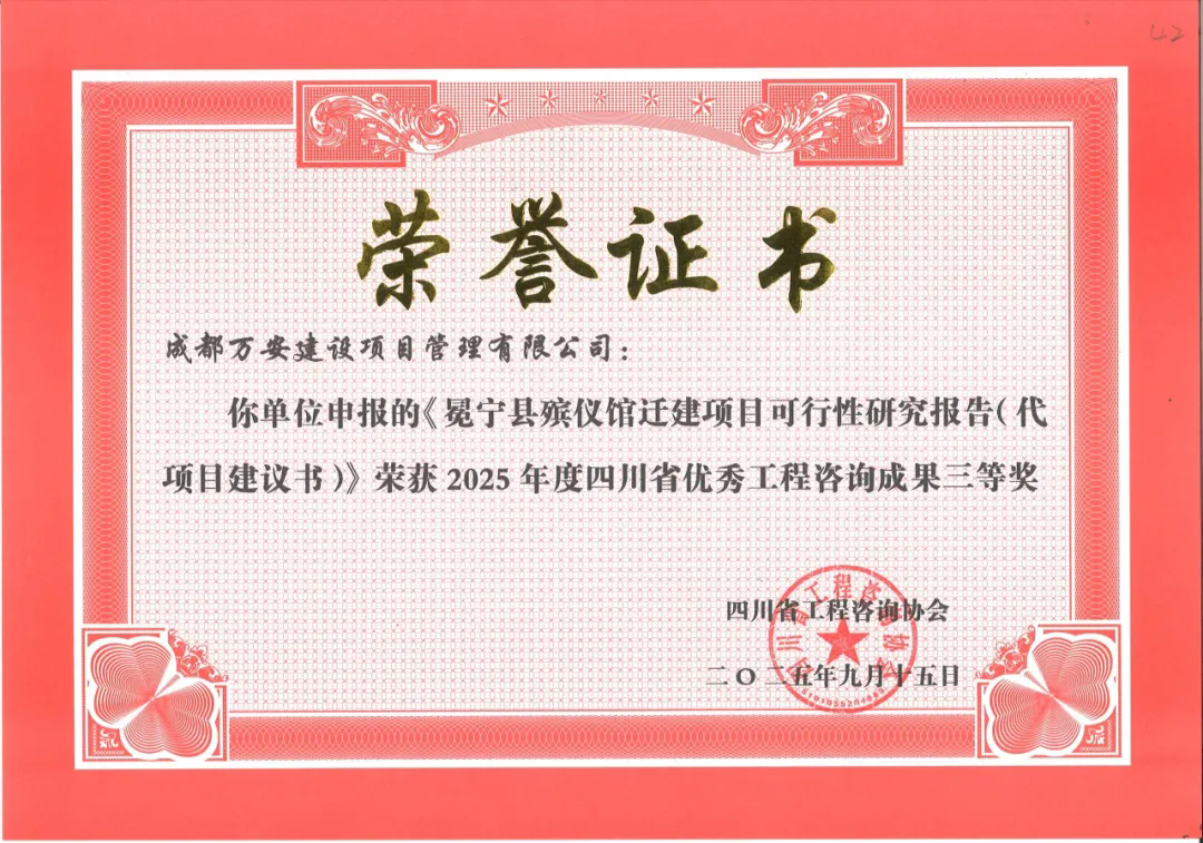 今年5月,四川省工程咨询协会开展了2025年度四川省优秀工程咨询成果水平评选工作。最终获奖名单于近日正式公布,成都万安建设项目管理有限公司(简称:万安项管)在此次评选中共有三个项目获奖,其中,二等奖一项、三等奖二项,获奖项目涵盖初步设计、重大项目咨询、特许经营咨询等多个领域。