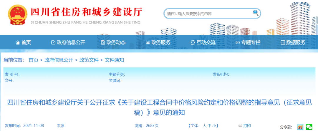 11月8日,四川省住建厅公开征求《关于建设工程合同中价格风险约定和价格调整的指导意见(征求意见稿)》意见。